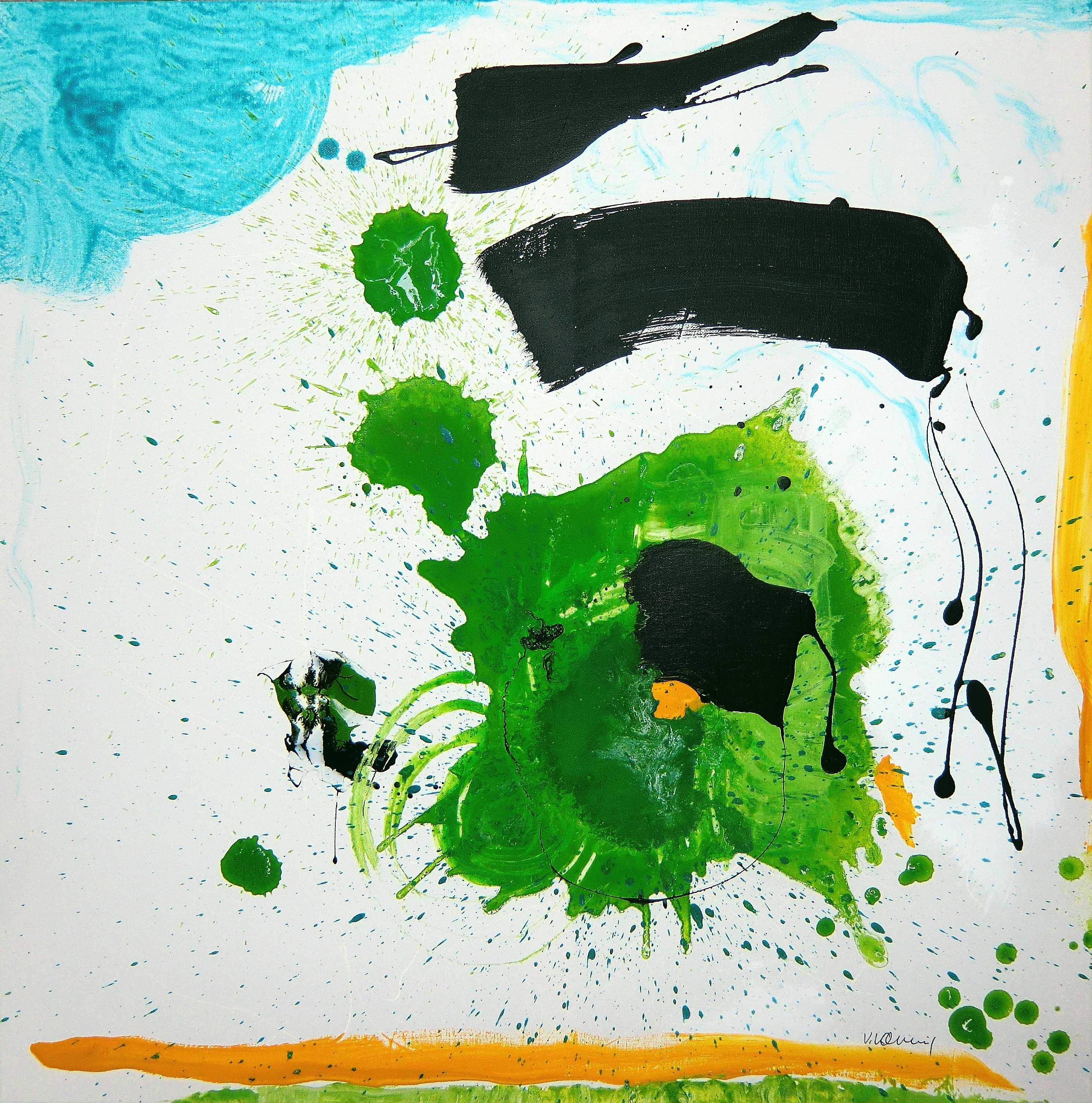 Und weils so schön war, wollte sich gleich noch ein „Grün“ ins Bild setzen und tupfte sich gemeinsam mit wolkigem Cyanblau auf eine neue Leinwand. Hier glänzt es jetzt und spritzt wirbelnd um sich herum bis hinein ins satte Gelb.