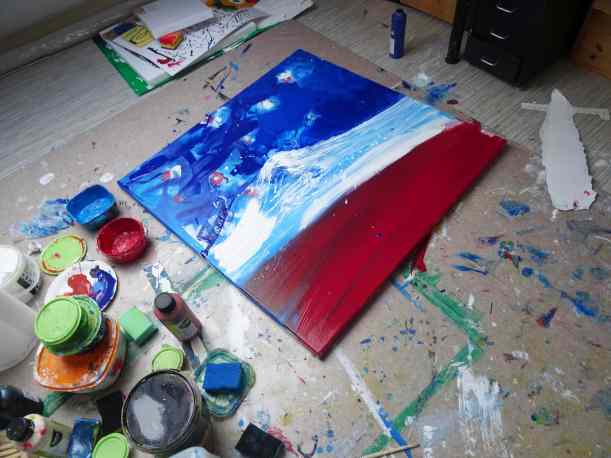 Heute dann fand ganz von allein die Farbe ihren Weg aufs Bild und hat sich nur erst einmal feucht aufs alte Bild gelegt…nun harren wir beide der Dinge die da noch kommen mögen 🙂